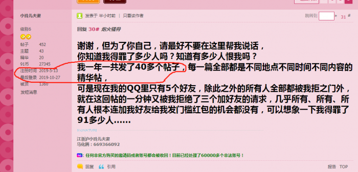 我承认我有点较真。但是并不是针对您,我是对您的话有百分之百的怀疑。QQ里面就5个好友,难道给您门槛费的只有五个人吗?还是交了门槛费因为不合适而被拉黑了呢?我觉得加您好友发门槛费的不止百人,怎么会只有五个呢。我也交了门槛在几位大神的好友位置或者群里,但您所说只是仅仅几位,我觉得您也太小瞧91论坛的号召力了吧。玩成人论坛的都是成人,希望您把我们论坛的夫妻或者单男都当做成年人来对待,而不是哄骗天真无邪的孩子那样子。也许我管得太多了,但是我不想惯着您这种把整个论坛的人当作傻子来对待。也许别人看到您发的帖子以求同存异的眼光来看待,但是我觉得总要有人说出来自己的建议,就算是只有我自己这样想!但也是我的真心话。。。。